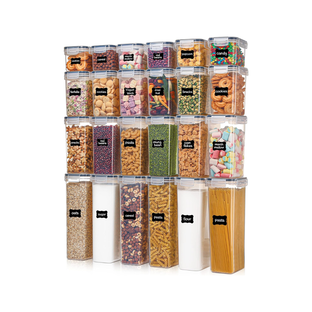 - 4 Size Combinations Fit Your Needs — Our kitchen storage container set comes in 4 different sizes. Includes 6 Tall Container (2.5quart/2.8 liters), 6 Large Containers (1.8quart/2.0 liters), 6 Medium Containers (1.5quart/1.6 liters), 6 Small Containers (0.7quart/0.8 liters). Perfect for storing spaghetti, baking supplies, cereal, flour, sugar, oats, pasta, rice, coffee, tea, snacks, nuts and other dry goods.
